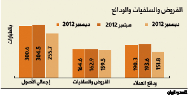 بلغ إجمالي الأصول 300.6 مليار درهم في 31 ديسمبر 2012، بزيادة 17.6 % عن إجمالي الأصول في 31 ديسمبر 2011، وبانخفاض 1.3 % عن إجمالي الأصول في 30 سبتمبر 2012. وبلغ إجمالي القروض والسلفيات للعملاء 164.6 مليار درهم في 31 ديسمبر 2012، وكان معدل نمو القروض البالغ 3.2 % أقل من المتوقع. وبلغ حجم ودائع العملاء بنهاية عام 190.3 مليار درهم بزيادة 25.4 % عن إجمالي الودائع في 31 ديسمبر 2011. ومثل الربعين الأول والثالث، شهد الربع الأخير إيداع وسحب ودائع حكومية كبيرة الحجم، وبعضها قصيرة الأجل، وقد وضعت هذه الودائع عبر مختلف فئات الأصول السائلة لتتماشى مع آجالها.
