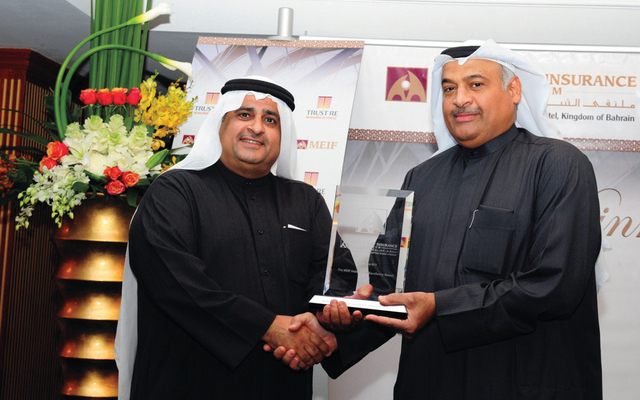 وسلم الجائزة عبد الرحمن محمد الباكر، المدير التنفيذي للرقابة على المؤسسات المالية في مصرف البحرين المركزي، إلى إبراهيم الريس، الرئيس التنفيذي للشركة البحرينية الكويتية للتأمين، خلال حفل عشاء متميز واحتفال بتوزيع الجوائز أُقيم على هامش ملتقى الشرق الأوسط السنوي التاسع للتأمين لعام 2013.