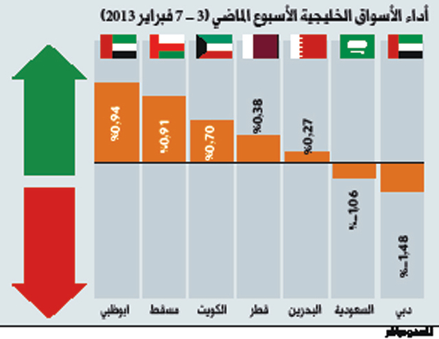 تصدر سوق أبوظبي للأوراق المالية خمس بورصات خليجية رابحة خلال الأسبوع الماضي وارتفع مؤشره العام بنسبة 0.94 %. وبلغت أحجام التداول في السوق خلال الأسبوع نحو 1.17 مليار سهم بقيمة 1.20 مليار درهم من خلال 8542 صفقة. فيما تراجع مؤشر سوقي دبي والسعودية بنهاية الأسبوع.