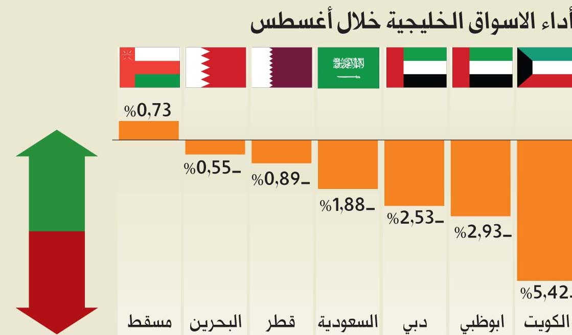 أغلقت مؤشرات ستة أسواق مال خليجية بمحصلة شهرية سلبية بنهاية تعاملات شهر أغسطس المنصرم، فيما انفرد سوق مسقط وحيداً بالارتفاع خلال الشهر محققاً مكاسب نسبتها 0.73 %. وجاءت معظم خسائر الأسواق المتراجعة في الأسبوع الأخير من الشهر متأثرة بالتوترات السياسية في المنطقة والعالم عقب التهديدات الأميركية الأوروبية بالتدخل العسكري في سوريا.