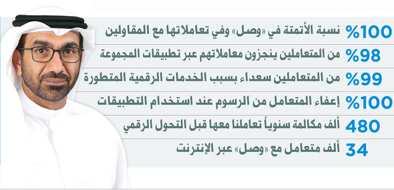 مؤكدا على أن "وصل" نجحت في أتمتة عملياتها الداخلية بنسبة 100% وتعاملاتها مع الموردين والمقاولين والشركات بنسبة 100% منذ 2011 ومن ثم تمكنت من تحويل "الإلكترونية" إلى "رقمية" بنهاية 2016 واليوم تجتهد في بحث فرص الاستفادة من (البلوك تشين) في تعاملاتها وخدماتها.
