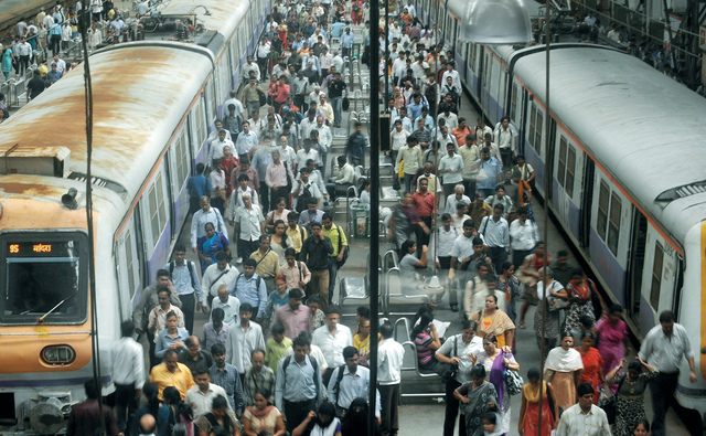 محطة قطارات مكتظة بالمسافرين في مدينة مومباي الهندية، حيث تشير تقارير صادرة من الأمم المتحدة إلى أن الهند ودولاً إفريقية تقود طفرة النمو السكاني، الأمر الذي يجعل من تلك الدول وجهة مفضلة للباحثين عن الاستثمارات في مجال النقل والخدمات والقطاعات الأخرى المرتبطة بالسكان.