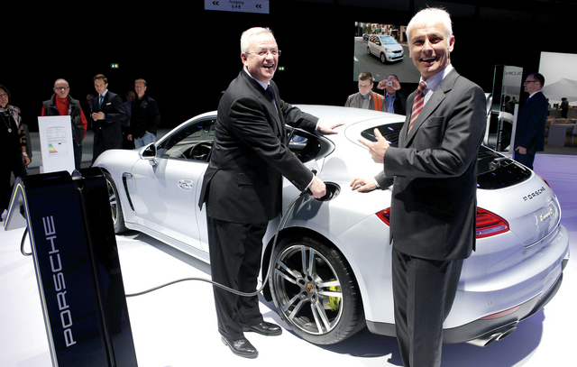 الرئيس والرئيس التنفيذي لشركة بورشه القابضة للسيارات مارتن فينتركورن (يسار) والرئيس التنفيذي لشركة صناعة السيارات الألمانية بورش ماتياس مولر يقومان بشحن السيارة بورشه باناميرا إس إي- الهجين أمام وسائل الإعلام قبل الاجتماع السنوي لحملة الأسهم في الشركة في لايبزيغ بألمانيا. حيث تراهن الشركة على هذه السيارة في اقتحام عالم السيارات الخضراء.