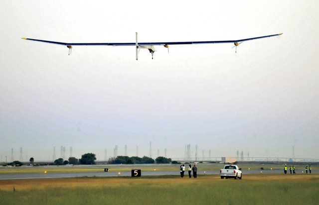 الطائرة سولار امبالس لدى اقلاعها من مطار موفيت جنوب سان فرانسيسكو متجهة إلى فينكس حيث حلقت الطائرة التي تعمل بالطاقة الشمسية لمدة 19 ساعة مسجلة رقما قياسيا بالتحليق فوق الولايات المتحدة من دون استخدام قطرة وقود.