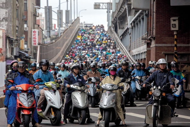 مئات الأشخاص يقودون دراجات نارية في أحد طرقات العاصمة التايوانية تايبييه، حيث تتزايد ثقافة الاعتماد على الدراجات هناك بشكل كبير. ويعتبر الكثير من التايوانيين أن الدراجات النارية وسيلة مفضلة، نظراً لاستهلاكها المنخفض للوقود، إضافة إلى قدرتها على تفادي الطرقات الأكثر ازدحاماً.