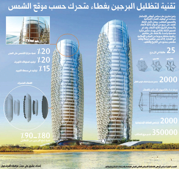 ويعكس مشروع البرجين إلتزام أبو ظبي بالتصميم المستدام. فقد صُنِعت المشربية من شبكة من النسيج الشفاف (PFTE) لتزود قاطني المبنى بمناظر مطلة على الخارج حتى عندما تكون الستارة محكمة الإغلاق. ولا يعد التصميم الشبيه بقرص العسل عملياً فيما يخص مسألة التظليل وحسب، وإنما يتميز بمرونته العالية ومقاومته لعوامل التلف أيضاً. وعلاوةً على هذا، ستقود هذه المبادرات المستدامة إلى تقليلٍ في استهلاك الكهرباء بنسبة 20% بالإضافة إلى 15% في الكلفة المالية لمحطة التبريد.