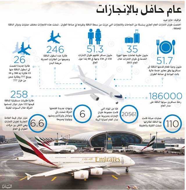 تطوي طيران الإمارات، أكبر ناقلة عالمية، عام 2015 بنمو كبير يتجلى في العديد من الإنجازات المهمة على صعيد الأسطول وشبكة المحطات ومبادرات تجارب العملاء. حيث زاد عدد الركاب الذين نقلتهم طيران الإمارات منذ يناير 2015 على 51.3 مليون راكب، أي بنمو نسبته 9% عن الفترة ذاتها من السنة الفائتة.