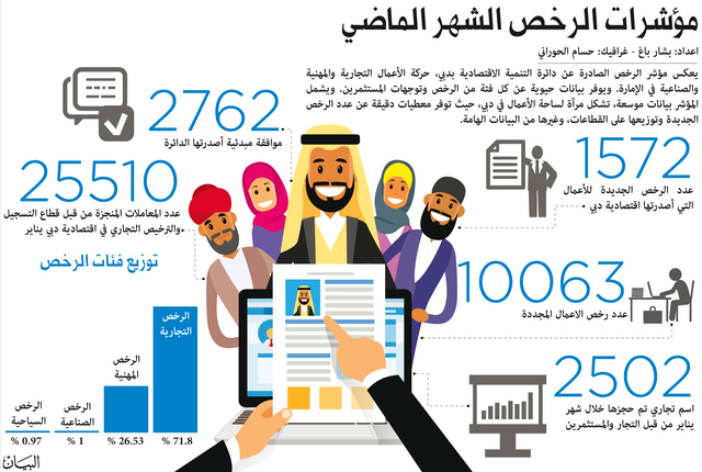 أصدرت دائرة التنمية الاقتصادية بدبي 1572 رخصة أعمال جديدة في شهر يناير الماضي، فيما بلغ عدد الرخص التي تم تجديدها 10063 رخصة، وتم إصدار 2762 موافقة مبدئية وحجز 2502 اسم تجاري، وبلغت عدد الرخص المعدلة خلال شهر يناير 7793 رخصة، فيما تم إلغاء 403 وإصدار 123 شهادات، حيث بلغ إجمالي عدد المعاملات المنجزة من قبل قطاع التسجيل والترخيص التجارية في اقتصادية دبي خلال الشهر 25510 معاملات.
