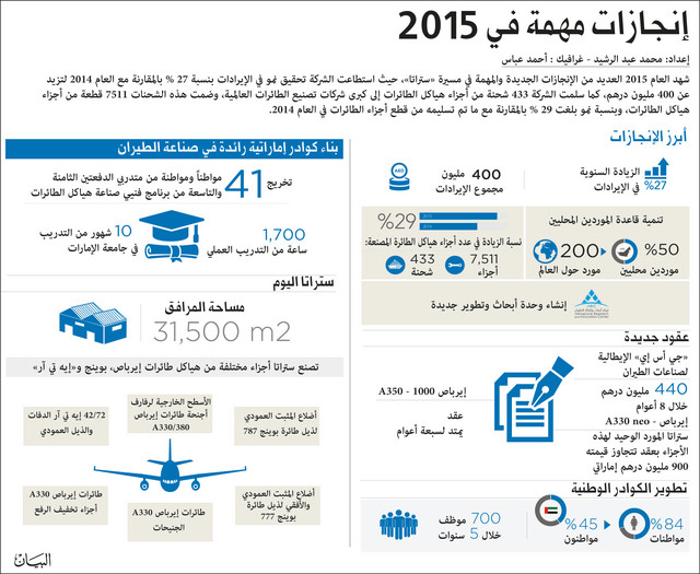 وأعلنت الشركة أبرز الإنجازات التي حققتها خلال عام 2015، في الوقت الذي تواصل فيه مسيرتها لتكريس موقعها ضمن سلاسل القيمة العالمية لصناعة الطيران، وبناء قاعدة عالمية لصناعة الطيران في إمارة أبوظبي.وقد شهد العام 2015 العديد من الإنجازات الجديدة والهامة في مسيرة «ستراتا»، حيث سلمت 433 شحنة من أجزاء هياكل الطائرات إلى كبرى شركات تصنيع الطائرات العالمية..