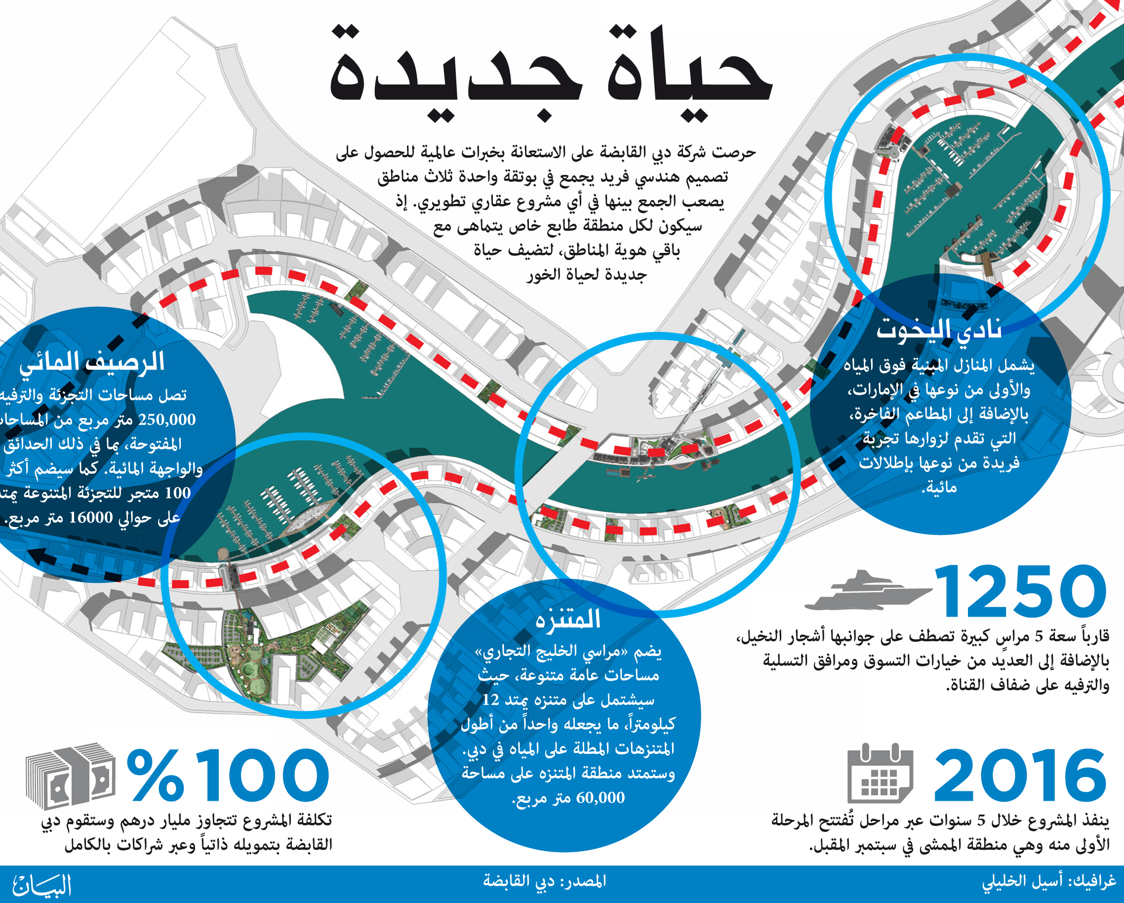 وقال معالي محمد عبد الله القرقاوي رئيس دبي القابضة تعليقاً على المشروع الجديد: «علاقة دبي مع مياه خور دبي علاقة تاريخية، والمشروع الجديد سيضيف حياة جديدة لحياة الخور، وبعداً جديداً لأسلوب البناء والسكن والسياحة على مياه الخور».