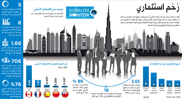 أما من ناحية عدد مشاريع الاستثمار الأجنبي المباشر، فقد جاءت الولايات المتحدة الأميركية في الصدارة بـ 18 مشروعاً، تليها المملكة المتحدثة بـ 6 مشاريع فالهند بـ 5 مشاريع وفرنسا بـ 4 مشاريع وألمانيا بـ 3 مشاريع، وتستحوذ هذه الدول الخمس على 54 % من العدد الإجمالي لمشاريع الاستثمار الأجنبي في دبي خلال الربع الأول من 2016.