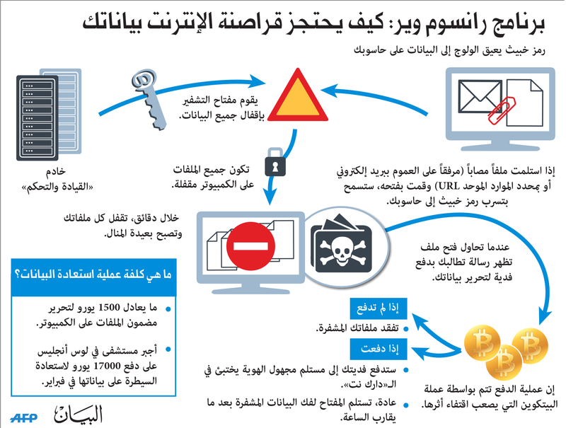 وبمجرد دخول الشبكة المستهدفة يشفر برنامج يطلق عليه (رانسوموير) بيانات أجهزة الكمبيوتر ويطالب بمبالغ مالية ما بين 300 و600 دولار، كي تعود الأجهزة للعمل بشكل طبيعي. ثم يصيب بصمت أجهزة أخرى غير محدثة دون أي تدخل بشري وهي قدرة يقول عنها خبراء أمنيون إنها تشكل تطوراً غير مسبوق وتهدد بهجمات جديدة قد تنتشر في الأيام والأسابيع المقبلة.