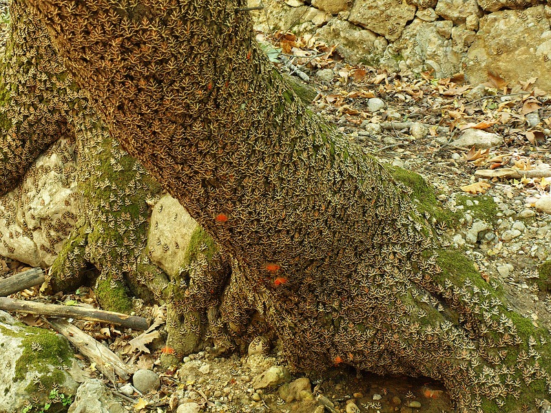 بمجرد وصولها إلى وجهتها، تستقر الفراشات على جذوع الأشجار والصخور وغيرها من الأسطح المتوفرة بأعداد هائلة.