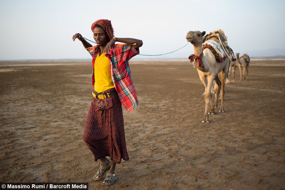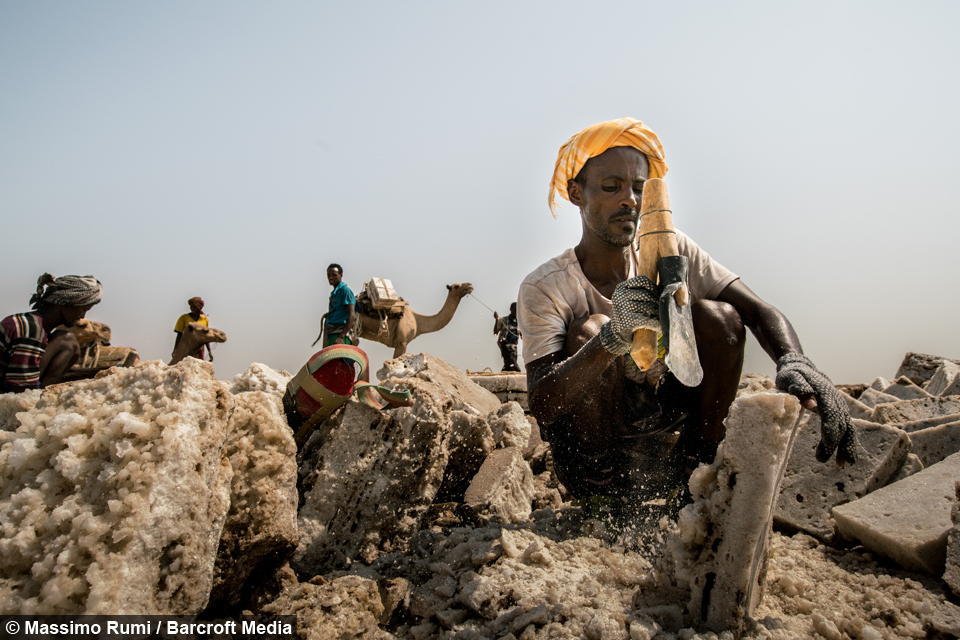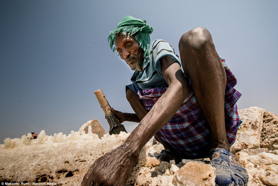 وخلال زيارته، التقى المصور العمال الذي ينتمون لقبيلة "عفار" وهم يخرجون إلى قطع ألواح الملح، والمعروفة باسم "البلاط "، من الأرض وتحميلها على جمالهم .