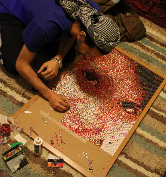 وبين ال صليع انه استخدم في لوحته اكثر من 17 الف حبه من الترتر المجوف (الخرز) بخمسة الوان قام بدمجها لتكوين الوان اخرى تعكس لون البشرة والظلال والإضاءة والنتوءات مشيرا الى ان فكرة التصميم جاءت من احد اصدقائه وهو محمد آل منجم الذي نصحه بتجسيدها باعتبار انه يملك الحس الفني والمهارة وقام بتوفير كافة المستلزمات اللازمة وشرعت في عمل مضني لأربعين يوما بواقع اربع ساعات يومية حتى انجزتها.