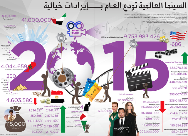 مع حلول مساء غد، تسدل السينما العالمية، الستار على 2015، الذي تودعه بإيرادات خيالية، سحبتها من جيوب عشاق السينما، ليبدو أن 2015 كان عام خير على هوليوود، التي تجاوزت فيه إيراداتها مليارات الدولارات، رغم دخول جملة من أفلامها تحت بند «الخسارة»، في وقت عانت فيه السينما المصرية من انخفاض ملحوظ في إيراداتها، مقارنة مع 2014، فيما شهدت فيه سينمات المغرب وفلسطين والأردن والإماراتية، تقدماً ملحوظاً، من حيث أعداد الجوائز التي اقتنصتها أفلامها في جولاتها حول مهرجانات العالم، لنشهد تأهل بعضها نحو جائزة الأوسكار، كما في «ذيب» الأردني، و«حجاب» الإماراتي.