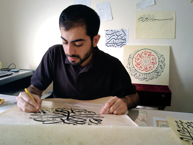 "كل حرف يعبر عن روح الأمة، لأنه يتضمن خزيناً هائلاً من العلاقة العاطفية والإنسانية والاجتماعية. عندما أخط لوحتي، هناك حرف يبرز وآخر يختفي، ولا يمكن أن يعوّض أحدهما الآخر أو يبرز على حسابه. أبتهج كثيراً عندما أخط لوحتي لأنها تمنحني الخيال والأفق". هذا ما قاله الخطاط الكويتي الشاب جاسم المعراج (1982) لـ "البيان" أثناء مشاركته بلوحتين في معرض دبي الدولي لفن الخط العربي في دورته السابعة. وفي أثناء الحوار، فاجأنا قائلاً: "إن هناك تدنياً في الذائقة الفنية العامة، بسبب غياب تفاصيل الخط العربي عن المعايشة اليومية في العمارة والشوارع والبيوت والإكسسورات الموجودة حولنا".