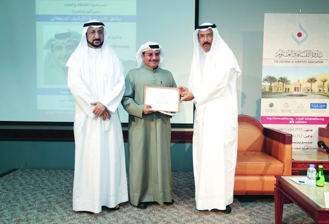 «وثائق الإمارات في الأرشيف البريطاني»، عنوان محاضرة الدكتور محمد فارس الفارس، مساء أول من أمس، بندوة الثقافة والعلوم في دبي، بحضور: الأديب محمد أحمد المر، وسلطان صقر السويدي رئيس مجلس إدارة الندوة، والدكتور محمد سالم المزروعي الأمين العام للمجلس الوطني الاتحادي، والدكتور سليمان موسى الجاسم. إضافة إلى مجموعة من المهتمين والباحثين.