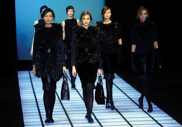 عارضات أزياء يقدمن تشكيلة متنوعة من مجموعة امبريو أرماني التي تنعكس فيها مزاج سيدات الأعمال الجادة والرصينة والألوان بأبعادها الغامقة التي تميل إلى الأسود تزينها الحقائب الجلدية المتوسطة الحجم في أسبوع الموضة لخريف وشتاء 2012 المقام حالياً في مدينة ميلانو الإيطالية ذات الشهرة العالمية في عالم الموضة والأزياء.