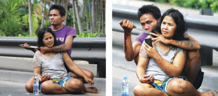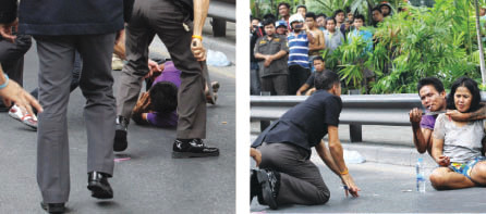 لقطات تُظهر بالتتابع رجلاً تايلاندياً احتجز زوجته قصد محاولة قتلها، أمس، في أحد الشوارع الرئيسة في العاصمة بانكوك، واستطاعت الشرطة بعد ساعات من النقاش معه حول تسليم نفسه أن تخلصها منه باستخدام عصا صعق كهربائي، حيث تم القبض عليه، و تبين لاحقاً أنه كان تحت تأثير المخدرات.