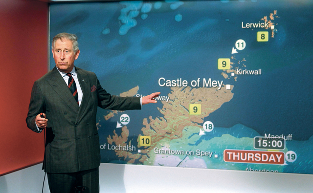 وأضافت أن الأمير تشارلز وقف أمام خريطة الطقس لتلفزيون (بي بي سي) في اسكتلندا، وقرأ نصاً كُتب خصيصاً له، وتضمن إشارات إلى المساكن الملكية في اسكتلندا. ونسبت (بي بي سي) إلى ولي العهد البريطاني قوله وهو يقدم النشرة الجوية، إن «أفضل الأحوال الجوية الجافة والمشرقة ستكون بالطبع في الجزر الشمالية وأقصى الشمال من البر الرئيسي لاسكتلندا، في حين سيسود جو بارد في كل مكان اليوم مع رياح شمالية نشطة السرعة، ونحمد الله لأن اليوم ليس عطلة». وأمضى الأمير تشارلز وزوجته دوقة كورنوال، أكثر من ساعة في مقر هيئة الإذاعة البريطانية في اسكتلندا، والتي تحتفل بمرور 60 عاماً على بدء بثها.