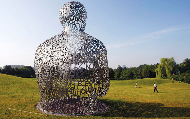 زوار يمرون بجوار تمثال عملاق يحمل عنوان «بيت المعرفة»، نفذه النحات الإسباني جيوم بلينسا في مدينة كييف في أوكرانيا، حيث تم عرضه لأول مرة أمس ضمن المهرجان العالمي الأول للنحت المعاصر. ويتكون التمثال من حروف لاتينية ممزوجة مع بعضها البعض، وهي ترمز إلى شجرة المعرفة الإنسانية.