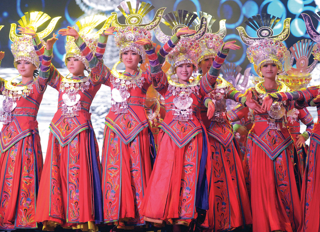 فتيات من قوميات مختلفة تنحدر من أنحاء الصين يرقصن، أول من أمس، في مهرجان فلكلوري سياحي في محافظة قويتشو جنوب غرب الصين. وقد زار أكثر من 56 مليون سائح قرى مختلفة في جميع أنحاء قويتشو، للتعرف إلى الثقافات الغنية والمتنوعة لهذه القوميات. وهذا ما أدى إلى إيجاد أكثر من مليون وظيفة في الصناعات.