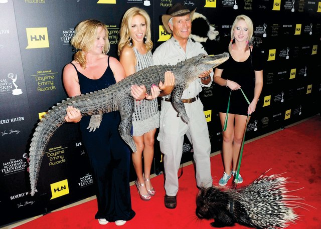 المغنية والممثلة ديبورا جيبسون، ومدرب التلفزيون جاك حنا وأخريات يحملن تمساحاً بوجود حيوانات أخرى لدى وصولهم أول من أمس إلى حفل توزيع جوائز إيمي في دورتها الـ39 في بيفرلي هيلز في كاليفورنيا.