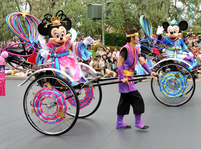 شخصيات والت ديزني ميكي وميني ماوس، تتربع على عربات كرنفالية احتفالا بـ(تاناباتا) أو مهرجان النجوم في ديزني لاند في أورياشو في ضاحية طوكيو أمس.