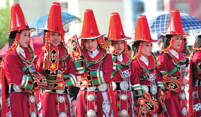 راقصات الأوبرا من منطقة التبت الصينية يستعدون لتقديم عروضهم الفنية بأزيائهم المزركشة في منطقة هاونغ نان تشو في مدينة تشينغهاي.