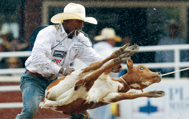الأميركي كوري سوليمون بزي راعي البقر التكساسي يحمل بين يديه عجلا كان يطارده في حلبة السباق الذي يتوقع أنه في طريقه إلى الفوز في نهائي مسابقة الروديو التي تبلغ جائزتها 100 ألف دولار. تقام المسابقة بمناسبة مرور 100 عام على ركوب الخيول غير المستأنسة (روديو) في مدينة كالغاري بولاية ألبرتا.