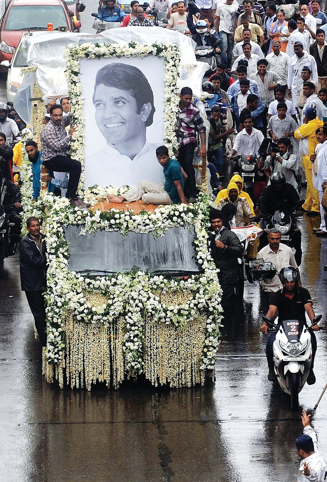 لم يكترث الآلاف من معجبي الممثل الهندي الراحل راجيش خانا بالأمطار الاستوائية التي تشهدها نيودلهي، وخرجوا للمشاركة في جنازته أمس، واصطف المعجبون في الشوارع وتتبعوا الشاحنة المفتوحة المزينة بالورود التي تحمل جثمان خانا الموضوع في نعش زجاجي، وشارك عدد كبير من الممثلين والمخرجين والعاملين في مجال السينما فى الجنازة.
