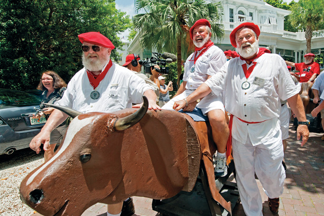 شبيه للكاتب الأميركي الراحل إرنست همنغواي، المشهور بولعه بمصارعة الثيران، يدفع أمامه مجسماً لثور يحيط به عدد من الأصدقاء ضمن احتفالية (الجري من الثيران) في شارع دوفال في كي ويست بفلوريدا أمس الأول. ويعتبر مهرجان أيام همنغواي بمثابة محاكاة وتقليد ساخر لمهرجان يحمل الاسم نفسه في جزيرة بامبلونا بإسبانيا .