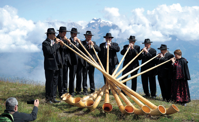 مجموعة من الرجال يعزفون في البوق، الذي يتخذ أشكال الغليونات الخشبية المعروفة، وذلك للاحتفال بمهرجان البوق في دورته الـ 11 في مدينة نينداس، جنوب شرق سويسرا أمس. ويعتبر من المهرجانات الموسيقية التقليدية التي تجذب أعداداً كبيرة من الجمهور من سويسرا وخارجها حيث يلعب العازفون على الألحان القديمة والحديثة.