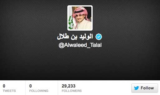 افتتح الأمير الوليد بن طلال حساباً رسمياً على موقع التواصل الاجتماعي "تويتر" قبل قليل، دون أن يسجل عليه أي تغريدات حتى حينه.