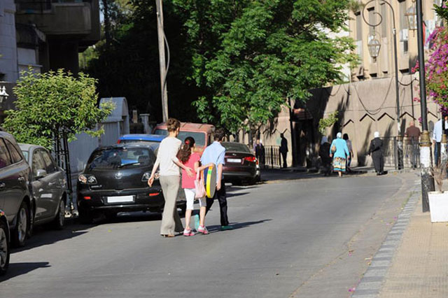 وتوضح الصورة التي تم التقاطها من الخلف، أسماء الأسد واثنين من أبنائها الثلاثة وهم في طريقهم إلى المدرسة سيرا على الأقدام، في محاولة على ما يبدو كي تظهر الاوضاع مستقرة في دمشق.