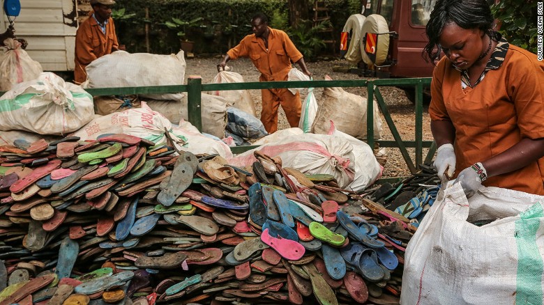 وتقول إيرين أن "أكثر من ثلاثة مليار شخص عبر العالم يرتدون أحذية "الفليب فلوب" المطاطية في الشواطئ، وكثيرا ما تضيع بين الرمال أو في المياه، وتصل أطنانا منها إلى ساحل شرق أفريقيا.
