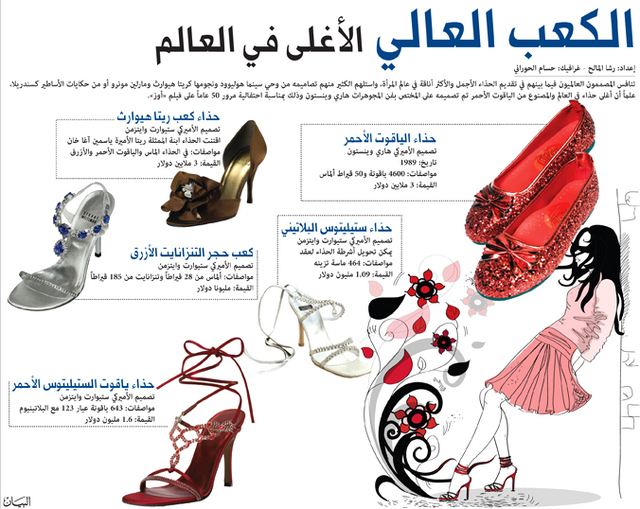 تنافس المصممون العالميون فيما بينهم في تقديم الحذاء الأجمل والأكثر أناقة في عالم المرأة، واستلهم الكثير منهم تصاميمه من وحي سينما هوليوود ونجومها كريتا هيوارث ومارلين مونرو أو من حكايات الأساطير كسندريلا، علماً أن أغلى حذاء في العالم والمصنوع من الياقوت الأحمر تم تصميمه على المختص بفن المجوهرات هاري وينستون وذلك بمناسبة احتفالية مرور 50 عاماً على فيلم «أوز».