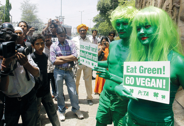 ناشطان يصبغان جسديهما باللون الاخضر ويحملان لافتة تدعو الى تناول الطعام الاخضر والنباتي وذلك خلال حملة للتوعية قبل انعقاد (اليوم العالمي للأرض )، في مدينة بوبال الهندية، حيث يتجمع نشطاء على هامش المؤتمر للتحذير من الدمار البيئي والدعوة الى عدم تناول اللحوم ومنتجات الألبان والتحول إلى الغذاء النباتي الصحي والحمية وما تنتجه الأرض من مزروعات صحية.