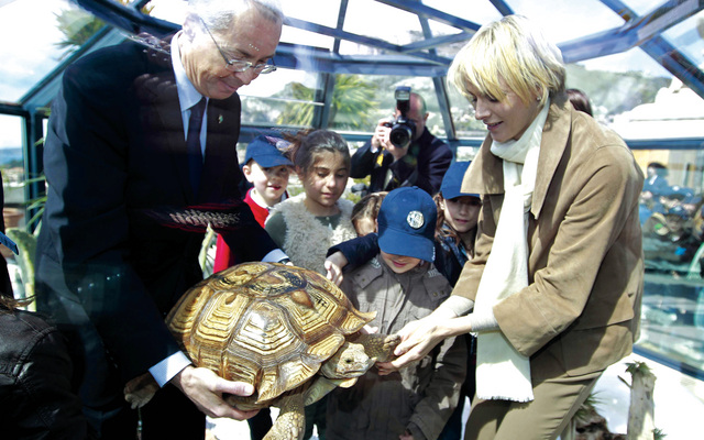 الأميرة شارلين، زوجة الأمير ألبيرت أمير موناكو، تلمس سلحفاة قدمها لها مدير متحف المحيطات في موناكو، خلال زيارتها أمس المتحف، للاطلاع على جهوده في حفظ التنوع البيئي، صحبها خلالها مجموعة من أطفال المدارس، تم تعريفهم بالكائنات البحرية التي تعيش في متحف المحيطات.)