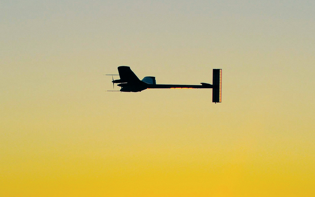 طائرة تعمل بالطاقة الشمسية في طلعة تجريبية بالقرب من مطار بايرن في سويسرا بالتوقيت مع شروق الشمس و يخطط الفريق الذي يشرف عليها التوجه الشهر المقبل لاختبارها فوق البحر الأبيض المتوسط وقد تستغرق الرحلة يومين ( 0052 ) كلم من سويسرا إلى المغرب ويمكنها التوقف في مدريد والرباط. )