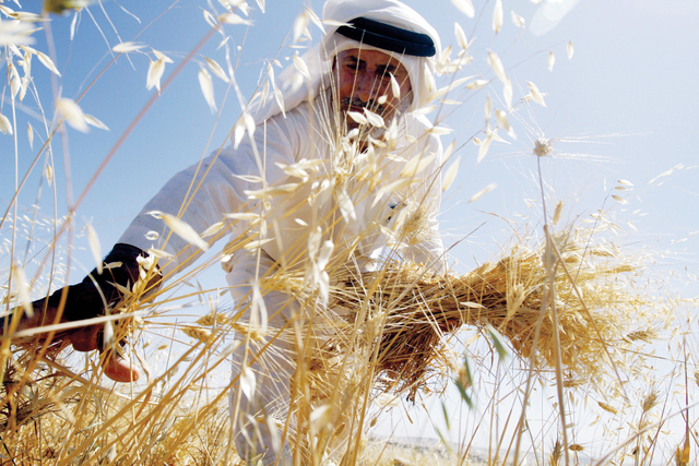 فلسطيني من الضفة الغربية يعمل في حصاد القمح في بيت لحم، حيث لا يزال الحصاد اليدوي على الطريقة القديمة يسيطر على الزراعة. وعادة ما يعمل الفلاحون الفلسطينيون وسط ظروف قاسية، ليست من الطبيعة، بل من أوامر الاحتلال الإسرائيلي وتراخيص الدخول والخروج إلى أراضيهم.