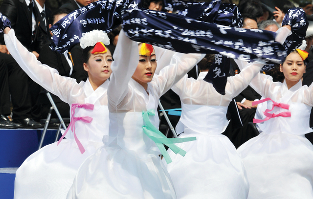 راقصات يرتدين الزي الفلكلوري الكوري، يؤدين في سيئول رقصات شعبية تراثية بمناسبة الاحتفال باليوم الوطني في كوريا الجنوبية أمس. وعادة ما تحمل النساء قطعة قماش تربط بين حركة الراقصات اللائي يتقدمن على خشبة المسرح ويقمن بتحية الجمهور الذي يردد معهن أبيات القصائد المغناة في هذه المناسبة.
