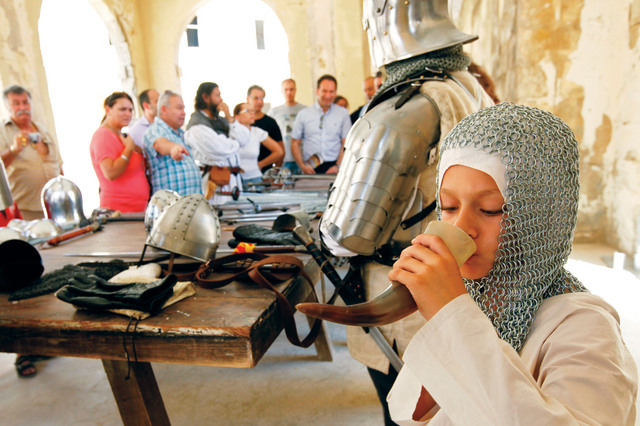 فتاة تتناول الماء من قرن حيوان خلال افتتاح الاحتفال بيوم القرون الوسطى في قلعة سانت أنجلو في إيطاليا أول من أمس، حيث كانت القلعة بمثابة المقر الرئيس لفرسان القديس يوحنا خلال حصار 1565، ويتم حالياً ترميمها من قبل صندوق التنمية الإقليمية الأوروبية بمبلغ 4. 13 مليون يورو.