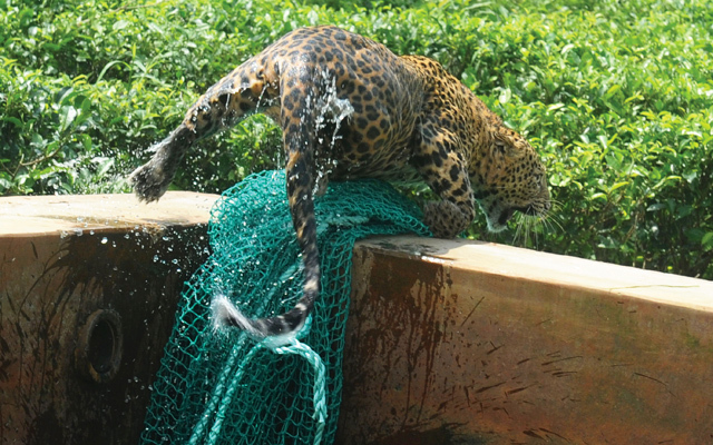 بعض حراس غابة هندية تقع في مدينة هاسكووا التي تبعد بـ 45 كيلومتر من إقليم سيليجوري، يستعدون لرمي الشباك إلى خزان المياه المخصص لسقي زراعة الشاي، حيث سقط فيه أحد الذكور البرية للفهود أمس. وكان الفهد غاضباً ومرتبكاً وخائفاً من الغرق، ولم يكن يفهم أن الحراس جاؤوا من أجل إنقاذه عبر رمي السلالم والشباك، ولكنه في الوقت نفسه كان يتشبث بأية قشة لكي يخرج من خزان المياه ،حيث شّد بأسنانه الشباك المرسلة إليه.