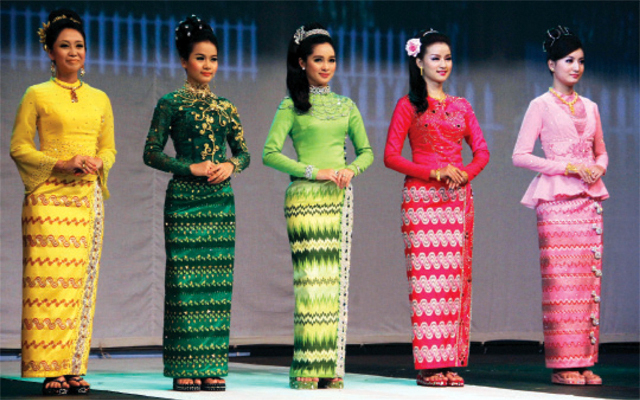 عارضات أزياء من ميانمار يعرضن نماذج من الفساتين التقليدية التي أبدعها المصممون المحليون خلال حفل على شرف يوم المرأة أقيم أول من أمس بالمسرح الوطني في يانغون . وتم تحديد يوم 3 يوليو ليكون يوم المرأة بميانمار وسيتم الاحتفال به سنوياً، تقديراً لما تبذله من جهود استثنائية لأجل موطنها.