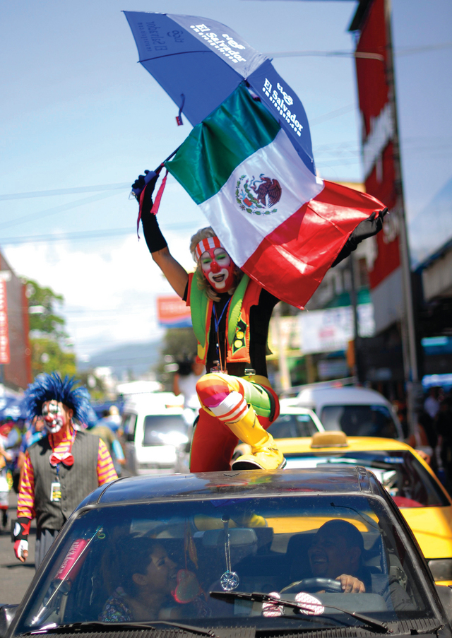 مهرج يقف على سطح السيارة، رافعاً العلم المكسيكي واخر يقف في منتصف الشارع، يسهل حركة المرور خلال المهرجان العالمي للمهرجين الدولي في سان سلفادور أول من أمس. وقد درج المهرجون القادمون من المكسيك وكولومبيا والولايات المتحدة الاجتماع في سان سلفادور لتبادل الماكياج والنصائح وقصص الحيل والنكات.