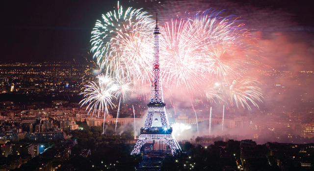 تابع الفرنسيون بفرح أمس ليلة صاخبة خلال احتفال أقيم في وسط باريس، التي تكللت بتزيين برج إيفل بالأنوار المضيئة والمبهجة والألعاب النارية الساطعة، حيث أضاءت سماء العاصمة الفرنسية بألوانها المتلألئة بمناسبة ذكرى العيد الوطني وتحطيم أسوار سجن الباستيل التاريخي الذي كان منطلقاً لانتصار الحرية وكسر قيود العبودية.