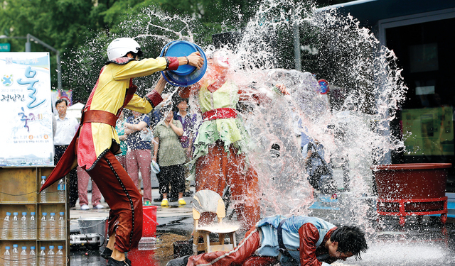وفي الصورة أحد الأشخاص يرش الماء الغزير على بعض المارة في شوارع العاصمة سيؤول، وهناك اعتقاد أن من يتم رشقه بالماء، تظهر عليه علامات الفرح، إيماناً منه أن البركة والحظ السعيدين تحلان عليه. وتشجع دوائر السياحة هناك هذه الطقوس من أجل ترويج السياحة.