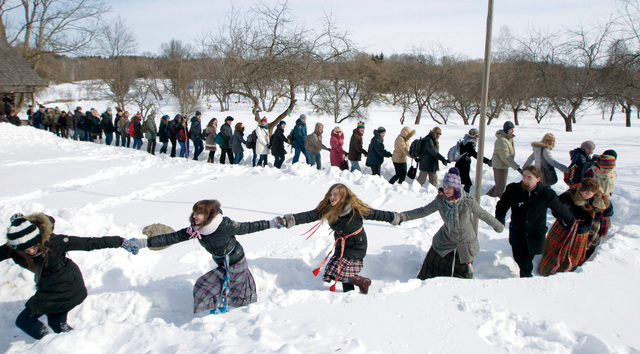 أهالي بيلاروسيا يحتفلون بمهرجان «مرحباً بالربيع» في قرية فيازينكا التي تبعد نحو 40 كيلومتراً شمال مدينة مينسك، أول من أمس. ويحتفل الأهالي في القرى والمدن على حد سواء بالتجمع والاصطفاف على شكل طوابير تسير في الثلوج، ويمسك بعضهم أيادي بعض، يرقصون وينشدون الأغاني بهذه المناسبة.